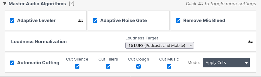Our Master Audio Algorithms loudness normalization, true peak limiting, and silence cutting are used on the final mixdown.